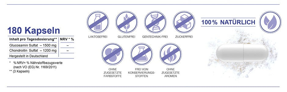 Das Glucosamin in unseren Kapseln wird aus dem Rohstoff Chitin (der Schale von Krustentieren) gewonnen und ist das hochwertigste auf dem Markt: Glucosaminsulfat. Dieses ist deutlich teurer als der minderwertige Rohstoff Glucosamin HCL, welcher von vielen anderen Herstellern genutzt wird. Fast alle Studien zur Effektivität von Glucosamin wurden mit dem Sulfat durchgeführt – für die Wirksamkeit des günstigeren HCL gibt es dagegen kaum Belege. Deswegen setzt 9 Leben gewohnt auf Qualität und verwendet den teuren Rohstoff Glucosaminsulfat.